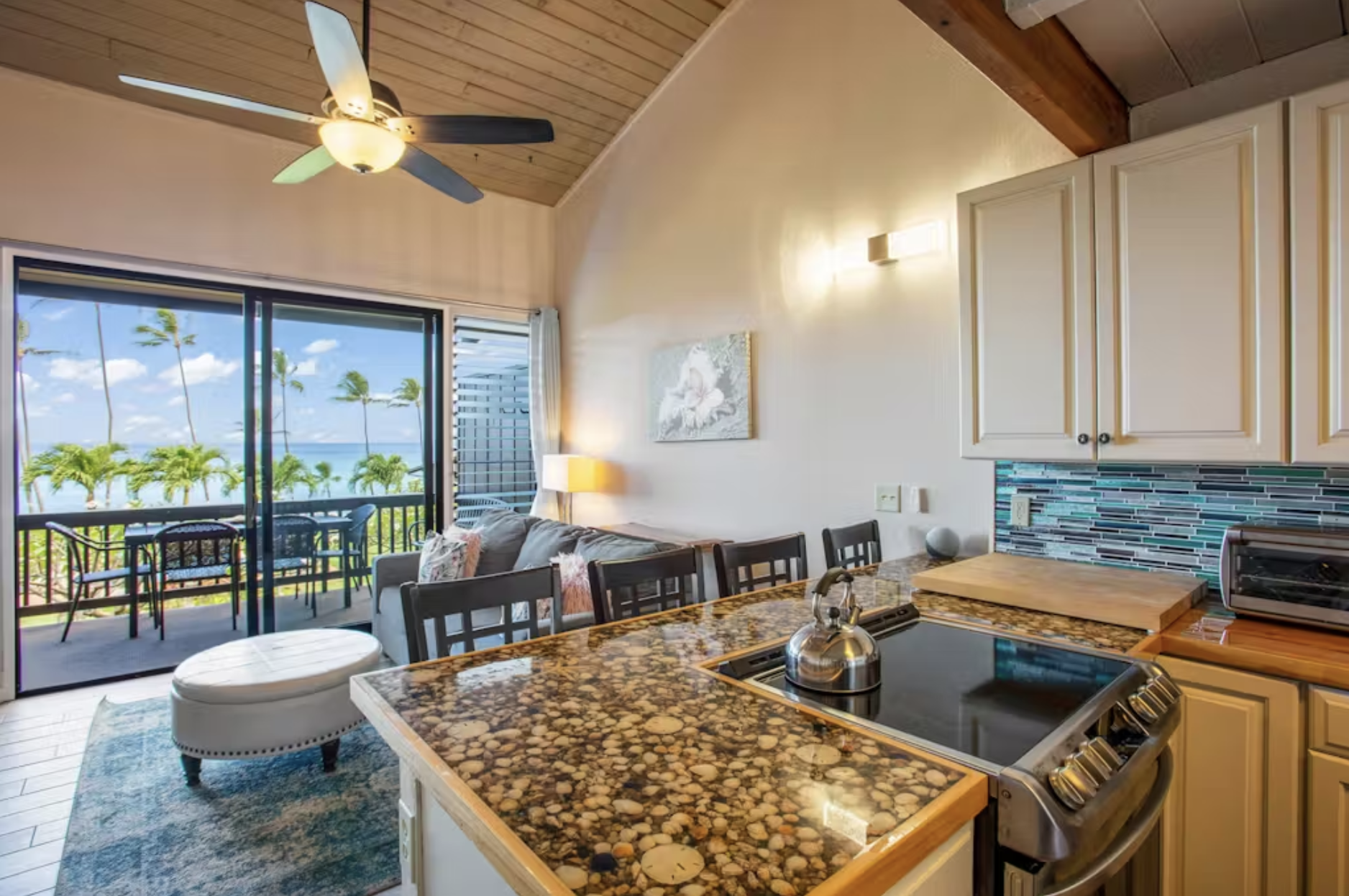 This townhome-style condo offers lanai dining. Or dine indoors at the beautiful one-of-a-kind seashell countertop breakfast bar with hidden treasures. Don’t worry, the high-speed WiFi and cable television are there if you need them. Make Mahina Surf 215 your favorite home away from home while visiting Maui. This is truly Hawaii’s “Best Kept Secret.”