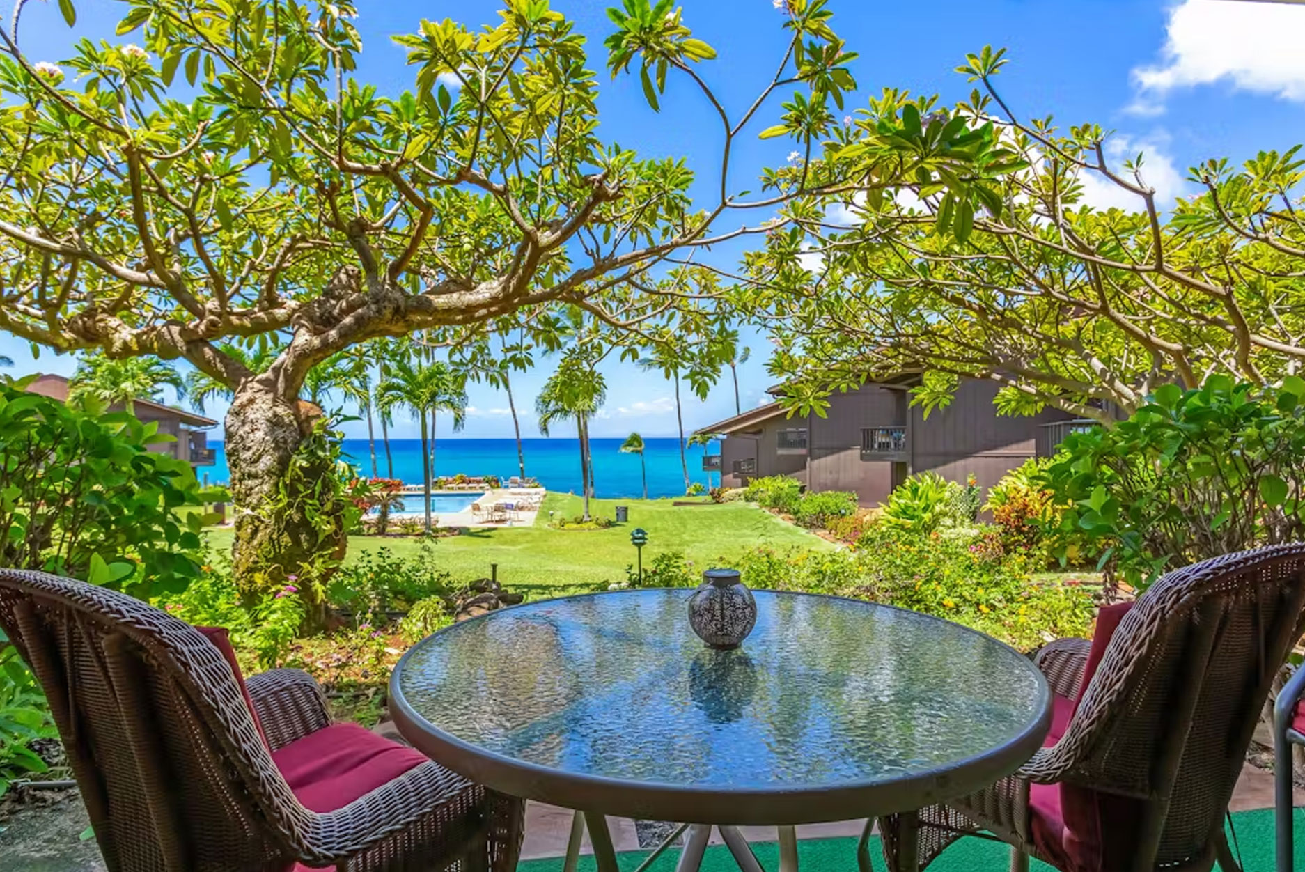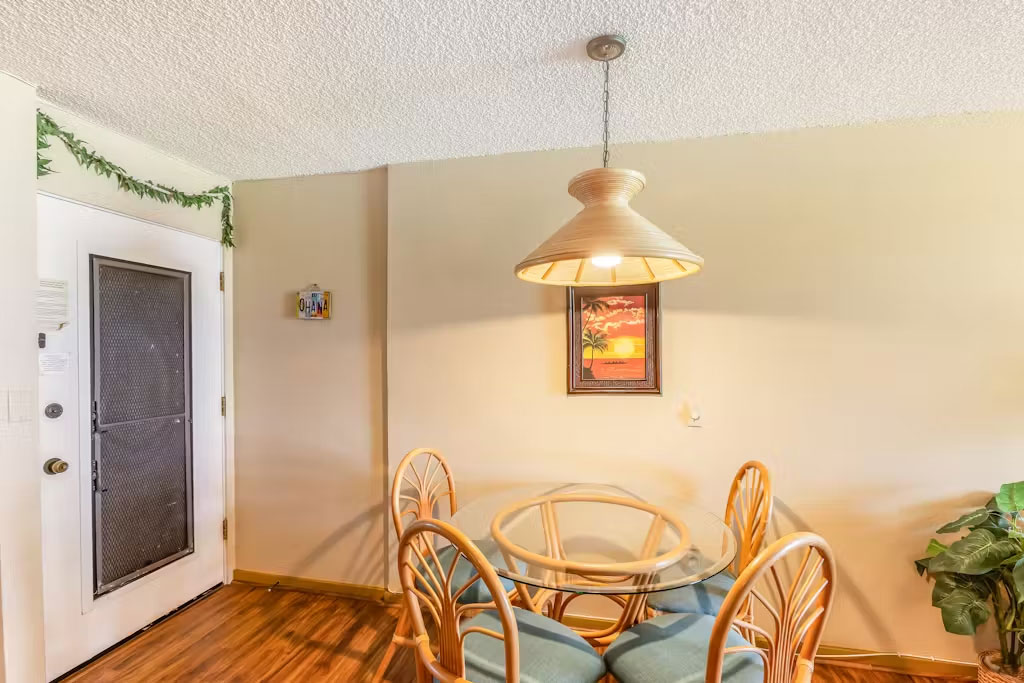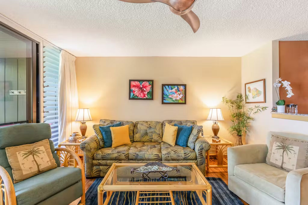 Your little piece of paradise awaits at this ground-floor, oceanfront home away from home! Ideal for a romantic escapade with your sweetheart or a solo trip to the Aloha State, this condo is equipped with all the essentials for an unforgettable retreat. A well-equipped kitchen will make meal prep a breeze with its modern appliances and utensils that include a full-size fridge, dishwasher, coffee maker, and a blender - ideal for cocktails! The dining table seats four, but you'll have the chance to dine alfresco at the private patio equipped with an outdoor table and two dining chairs. Enjoy memorable sunsets and feel the stress slowly but surely leave your body. The inviting living area offers a great spot to relax with flowery decor, a sofa, and two armchairs. Everything has been strategically located in front of a TV with cable. Three ceiling fans - bedroom, living room, and bathroom, will make sure your stay is as breezy as possible. Spend endless hours in the shared outdoor pool, or surprise your guest with a delicious BBQ using one of the many gas grills available.