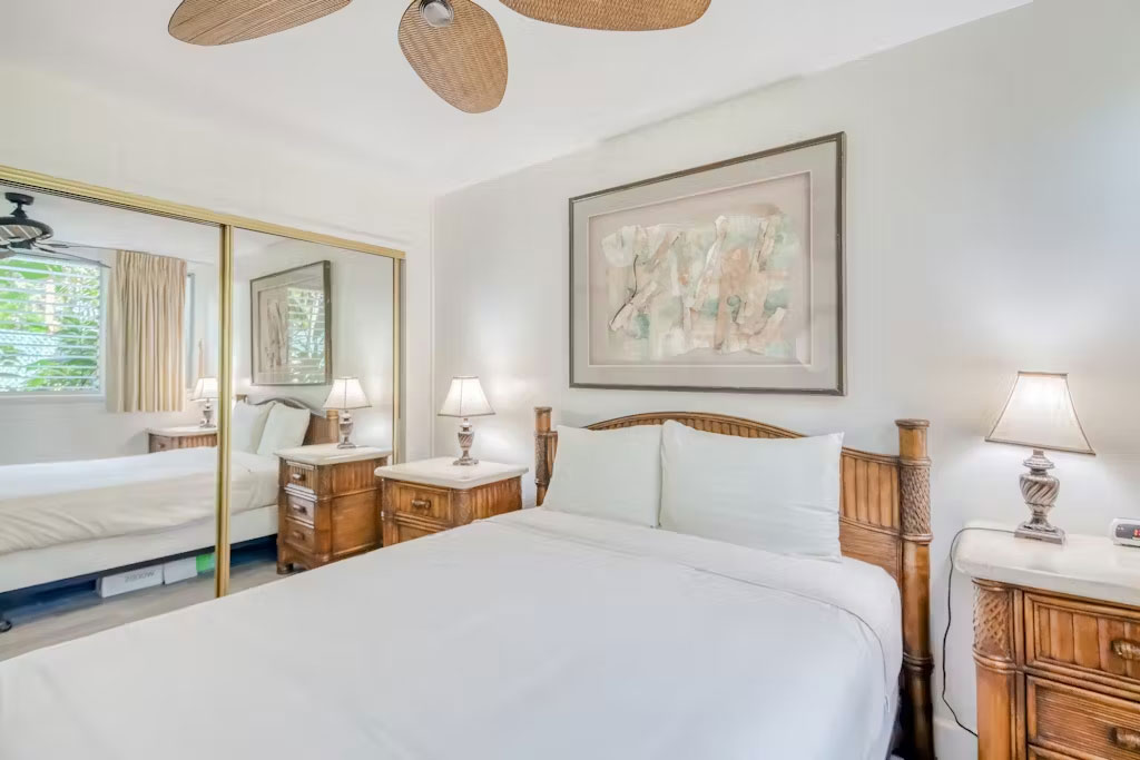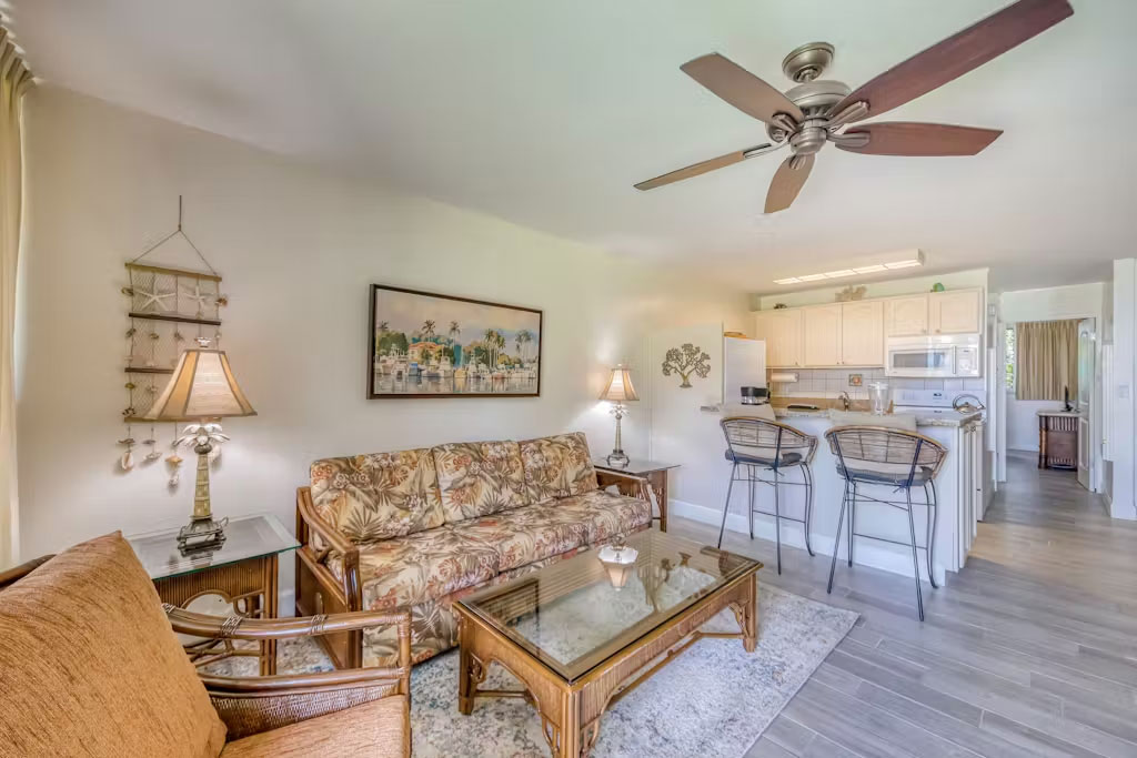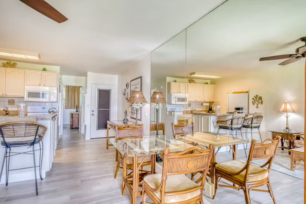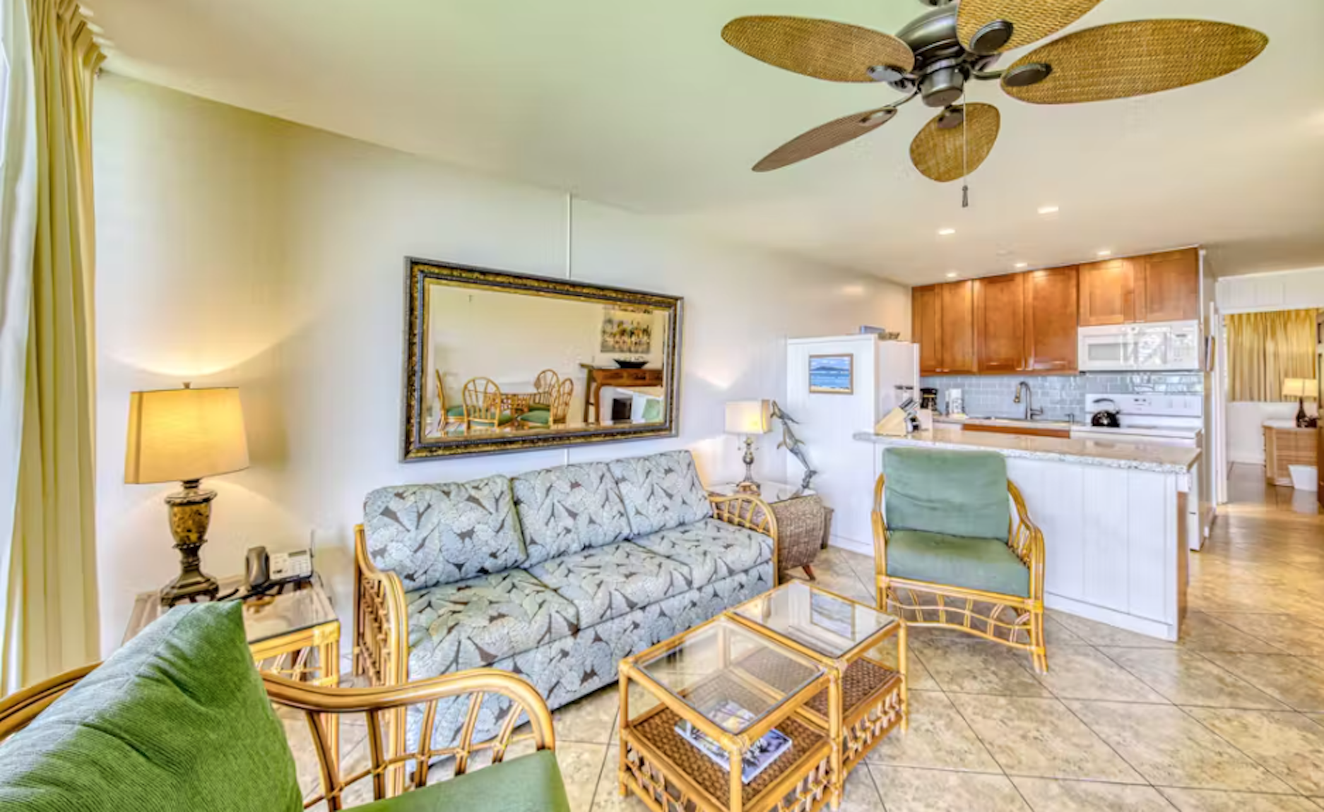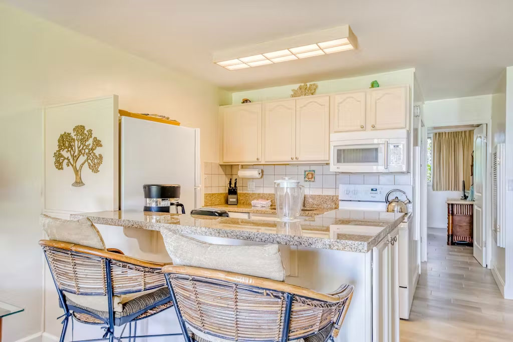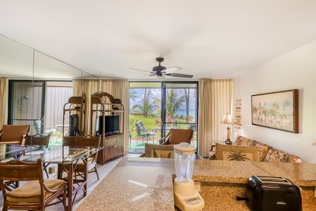 Kick back and relax at this oceanview condo where you can open your sliding glass doors and welcome in the Hawaiian sunshine and sea breezes. Inside this condo, you'll find a well-equipped, full kitchen, an intimate dining table, and a cozy living area with rattan furniture, a cooling ceiling fan, and a TV all ready for movie nights. This condo also includes a desk and chair and high-speed WiFi in case you need to do some remote work or schooling while away from home. You will also enjoy access to a shared pool just a short walk from your door.